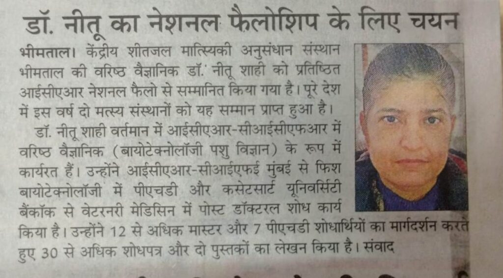 (Amar Ujala 1-12-2025):- ICAR-CICFR, Bhimtal Senior Scientist Dr. Neetu Shahi Awarded ICAR National Fellowship.